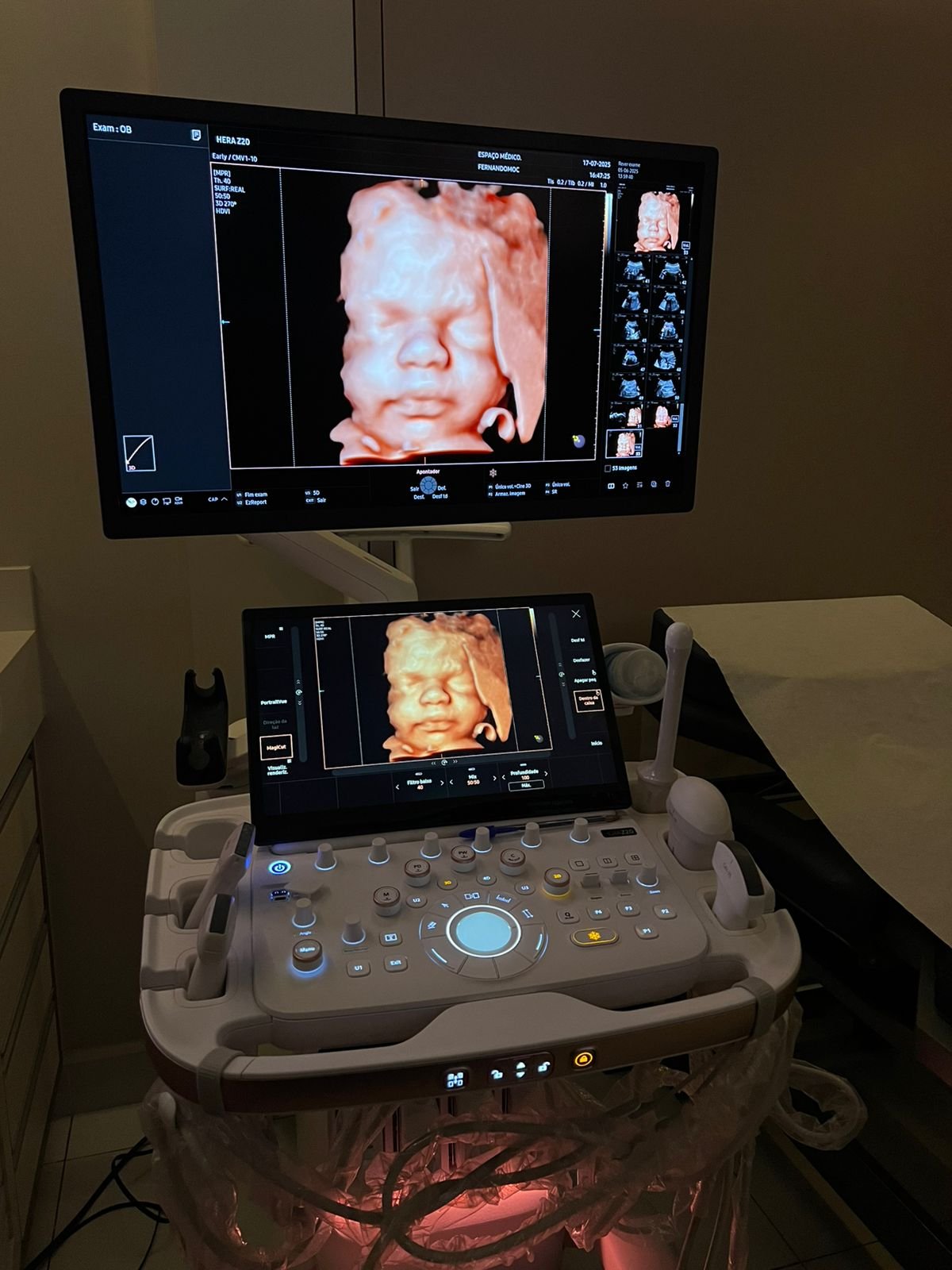 É o exame mais bonito. Dá para ver o rostinho do bebê, suas expressões faciais, se o bebê está bocejando, chupando o dedo, brincando com o cordão. É aquele exame colorido, como se houvesse uma câmera filmando o bebê dentro do útero. Época ideal: 26-32 semanas a depender da posição do bebê. Mas pode ser feito em qualquer época se o bebê estiver bem posicionado.